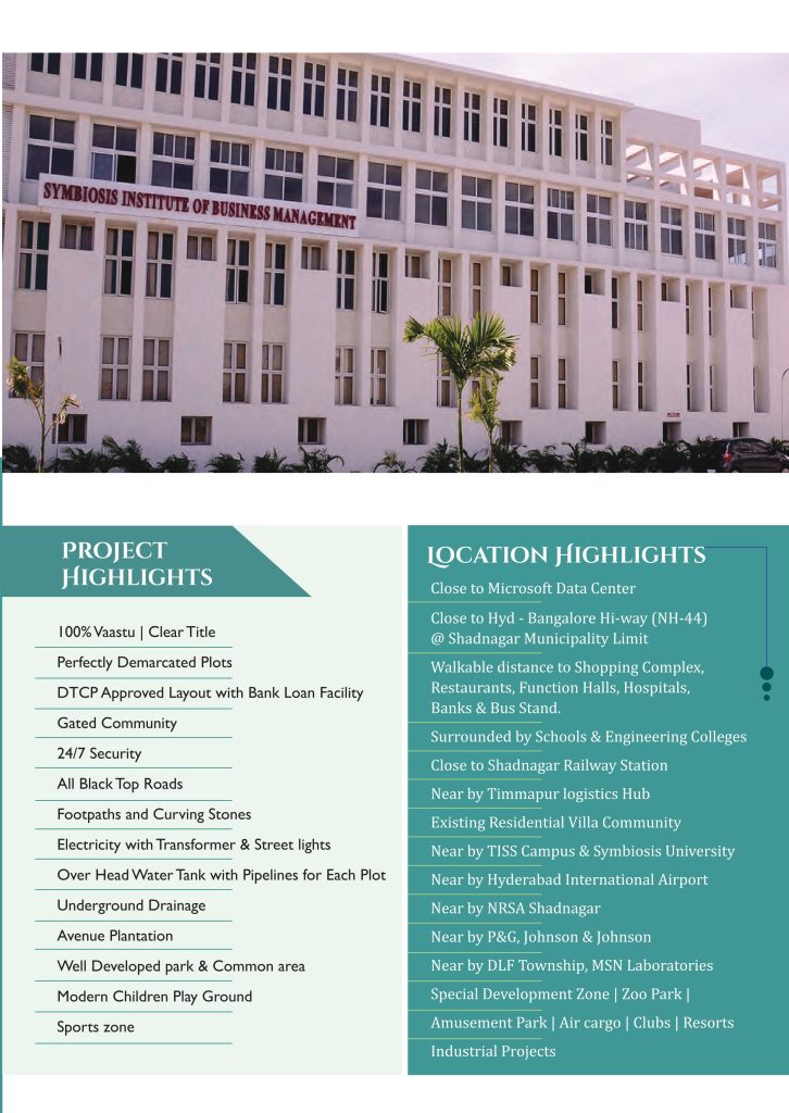 - Proximity to tech hubs, highways, railways, and the Hyderabad International Airport.