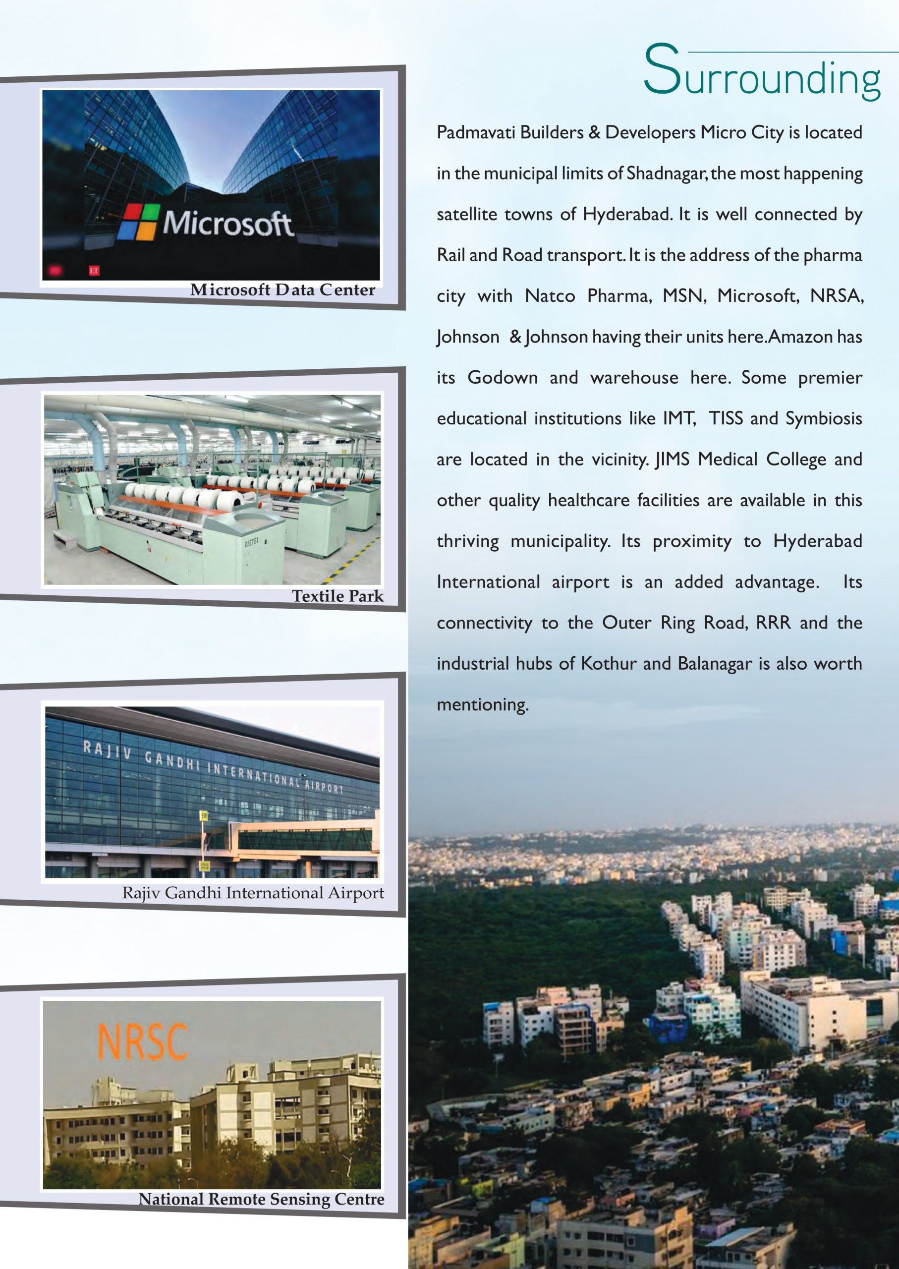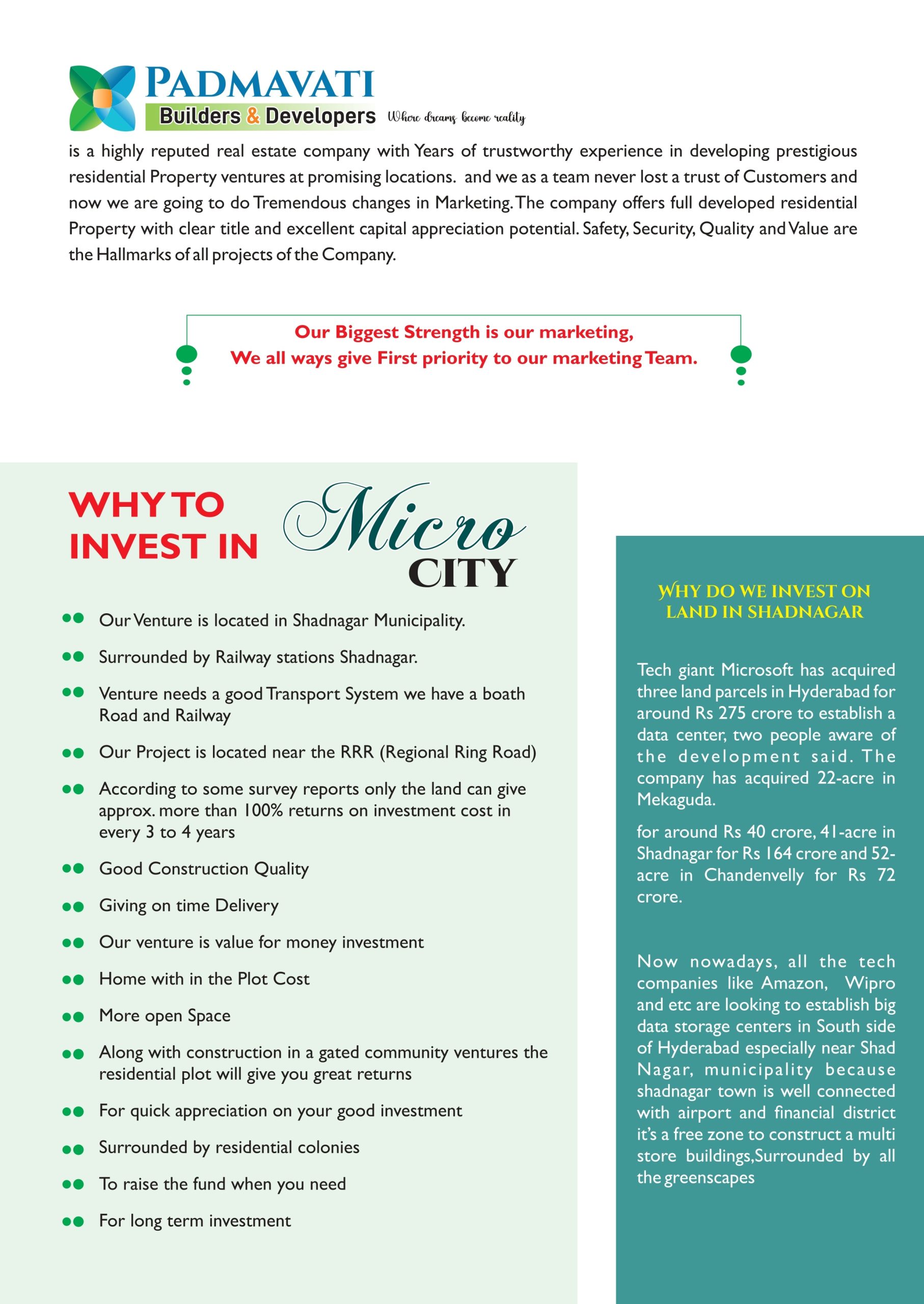 "Invest in Micro CITY, Shadnagar – where quality meets growth. With tech giants like Microsoft investing nearby, enjoy excellent returns, modern infrastructure, and on-time delivery. Your dream home and smart investment start here!"